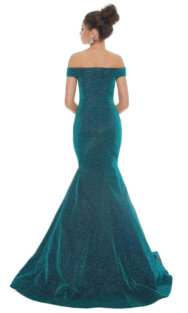 | Details: | Off-shoulder sleeves, Fitted bodice, Metallic scuba, Fitted bodice, Mermaid skirt, Sweep train, Back zipper |