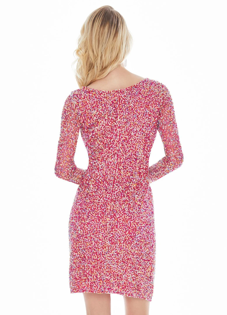 Step right into a style that will always exude an enchanting allure in this picture-perfect Ashley Lauren 4130 creation. Bountifully sequined in shimmering sequins, this fully festooned stunner presents a jewel neckline framed with long sleeves. Crafted with a slightly scoop back, the sheath skirt has a sleek silhouette and finishes with a modest short hem. Orchestrate a grand entrance in this dramatically ornate Ashley Lauren masterpiece.