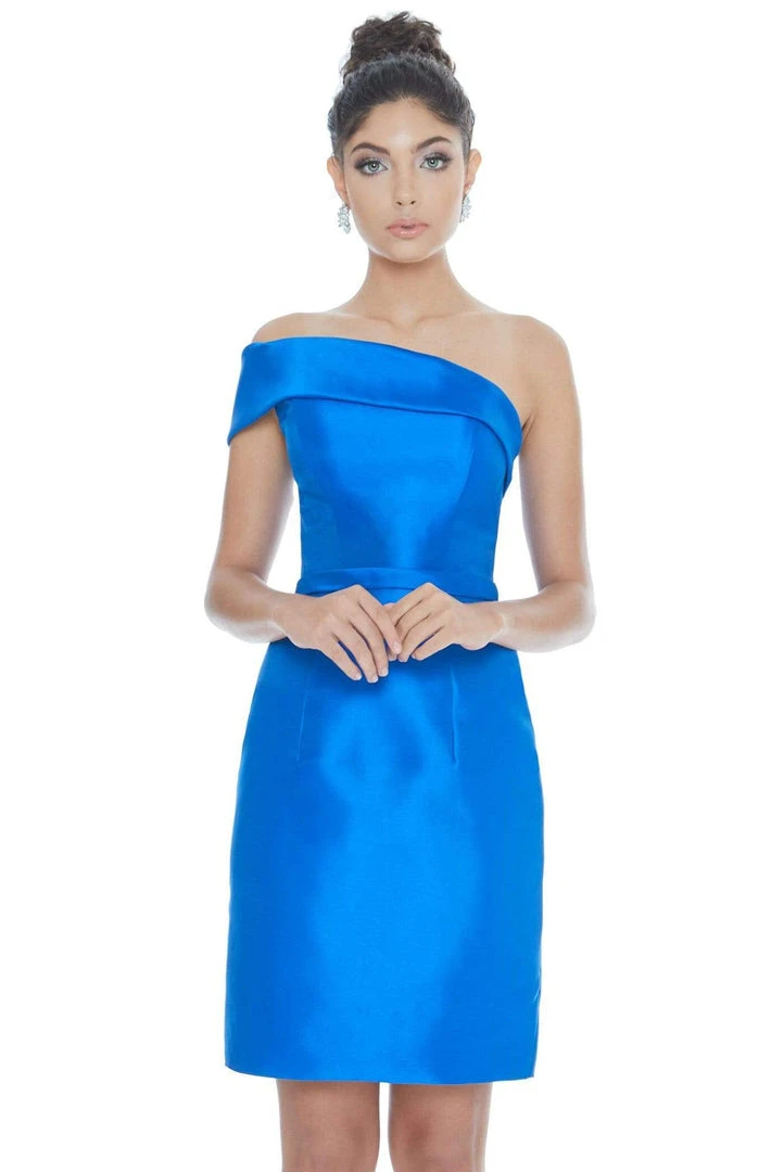 Display your classy side in this sophisticated cocktail dress by Ashley Lauren 4215. Beautifully tailored in Mikado, this stellar piece features a fitted bodice with a folded asymmetrical neckline supported with a single shoulder sleeve. A thin belt accents the natural waist as it gives way to the column skirt that cascades to above the knee hemline. Beam with pride as you don this glamorous Ashley Lauren ensemble. The model is wearing Royal color.
