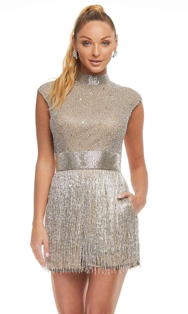 Dare to show off your style in a fashionable Ashley Lauren 4460 romper. This romper showcases a high neckline supported by cap sleeves in a fitted and embellished bodice with fringe bottom. This also shows an open back with back zipper closure to complete the look. Strike a pose in this trendy Ashley Lauren creation.