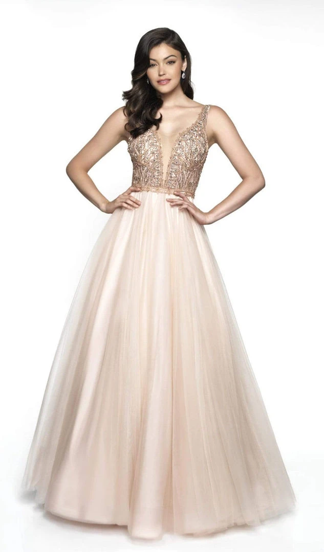 Shimmer all night long in this stunningly phenomenal Flair Prom 19210 creation. Beaming with radiant stones and shimmering beadwork on a sleeveless bodice, this beauty shows a plunging sweetheart neckline with an illusion modesty inset. Gorgeously embellished with crystals on a sheer v-open back, the A-line skirt revels in gossamer tulle layers that touch the floor with a full-length hemline. Lead this spectacular event in divine elegance in this Flair Prom masterpiece. Models are wearing the Blush and Silver colors.