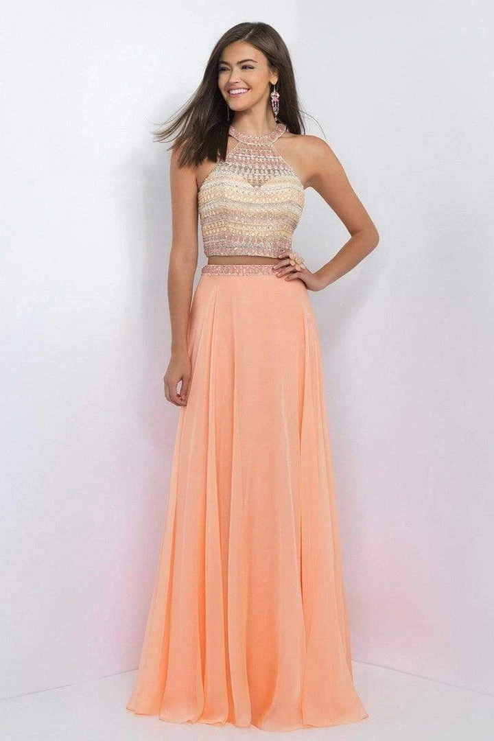 Wow everyone in this dazzling two-piece evening gown from Blush 11056. The top has lively beading and stones throughout the bodice. The midriff is bare. The coordinating skirt has sparkling stones at the high waist. The skirt has a soft sweep with sheer overlay and finishes with a full length hem. This Blush creation is simply perfect for your next formal party!