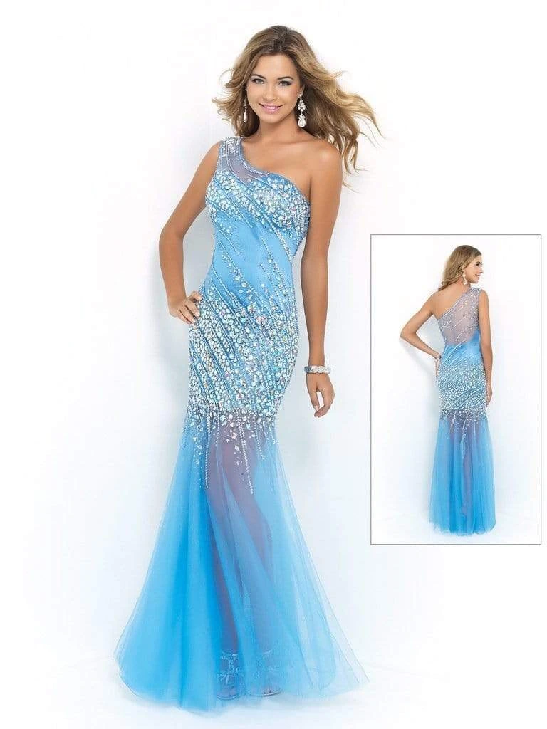 Shimmer and shine in an ethereal masterpiece from Blush X233. This glamorous evening dress features an asymmetrical neckline with sweetheart bodice supported by an illusion thick single strap which leads to the sheer back. Crystal embellishments elegantly beautifies the bodice that is sure to stand out from the crowd. The sheer skirt is pleated which flares down stunningly to the floor highlighting a trumpet silhouette. You are sure to sparkle at your special event with this Blush creation.