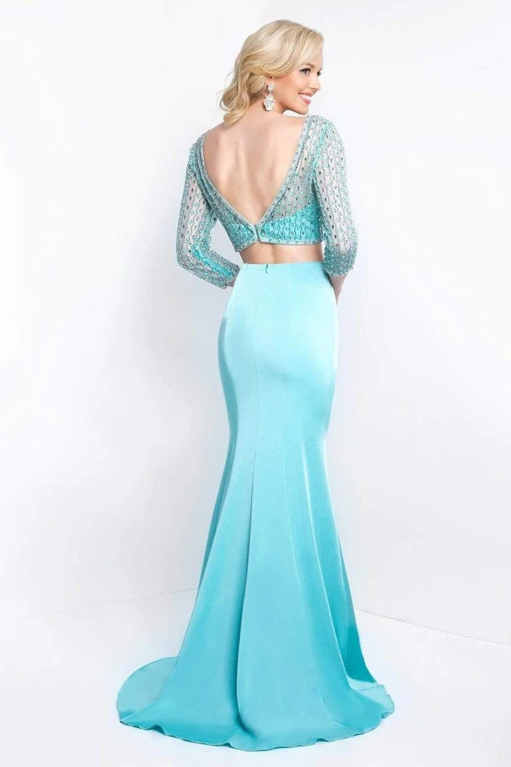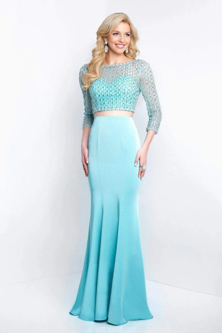 Look stunning in this vogue dress by Intrigue 438. This gown is a trendy two piece dress with an eye catching fully beaded crop top with quarter length sleeves and an illusion bateau neckline in a sweetheart shaped bodice. The long fitted skirt is made of a luxurious crepe material. This Intrigue creation is simply breathtaking!