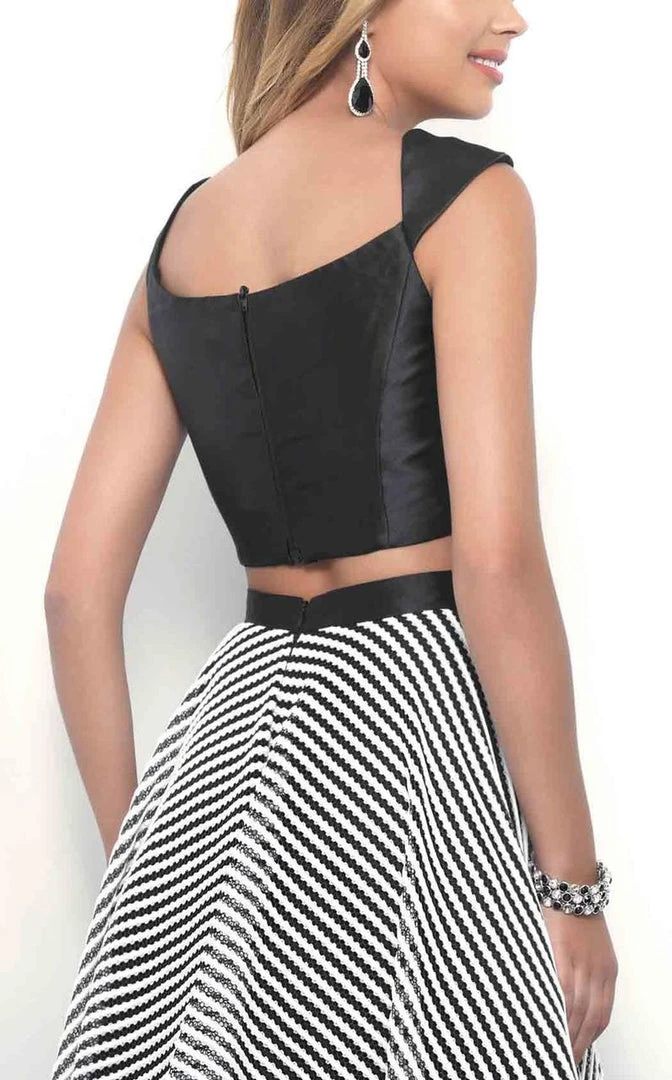 | Details: | Mikado, Two-Piece, Crop Top, Cap Sleeves, Straight-Across Back, Simple Waistband, Striped Skirt |