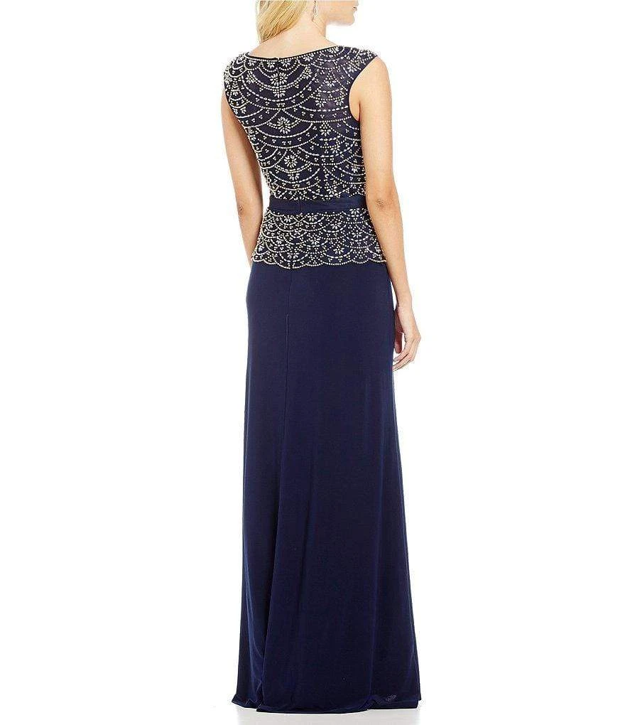 | Details: | Jersey, Mesh, Rhinestone Ornate, Cap Sleeves, Slender Waistband, Peplum, Sheer Back, Back Zipper Closure, Full Length Hem |