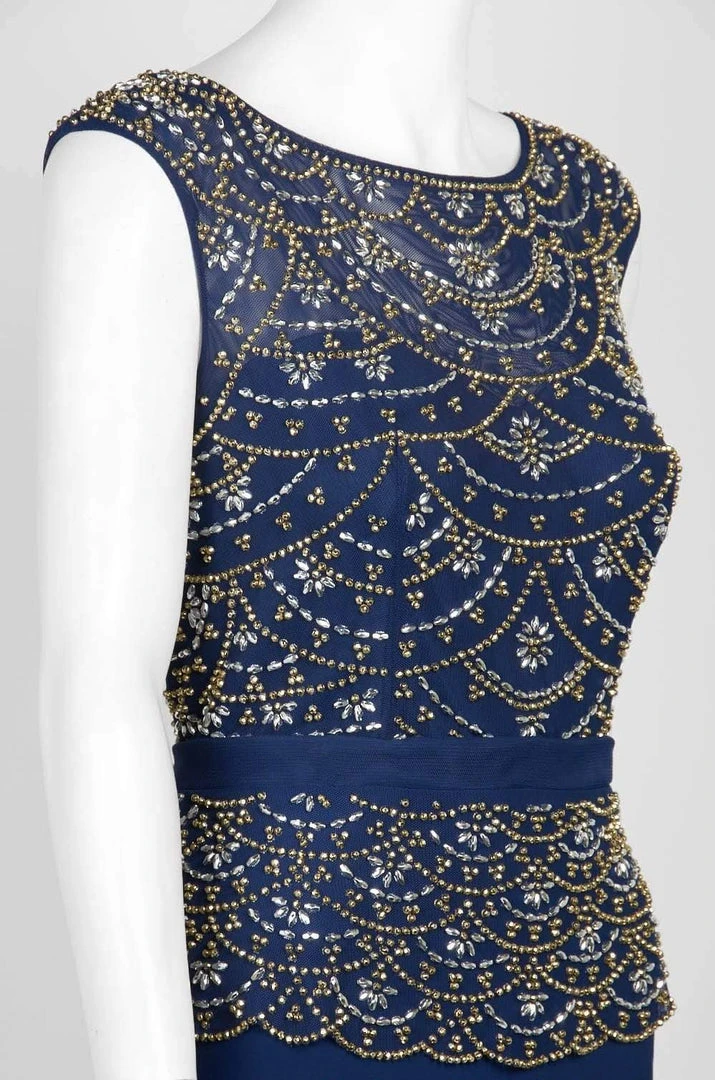 Lavish yourself in stunning elegance in this timeless Cachet 58245 creation. Fascinatingly detailed with rhinestones on a sheer mesh fabric, this ensemble shows an illusion bateau neckline framed with cap sleeves. Designed with an adorned full back and embraced with a slender band atop a peplum design, the fluttering sheath skirt falls into a full-length hemline. Glamour up as a regal beauty in this chic Cachet masterpiece. Model is wearing the Navy Gold color.