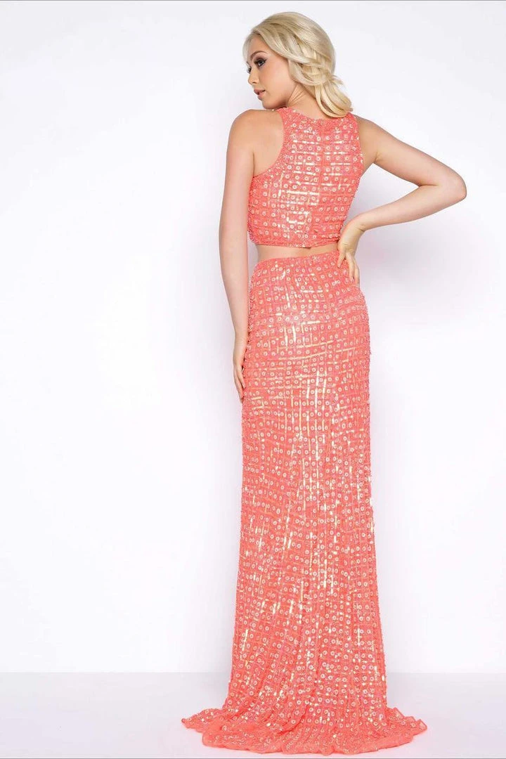 | Details: | Two-Piece, Jersey Knit, Geometric Beaded Bodice, Embellished Waistband, Semi-Open Back, Sweep Train |