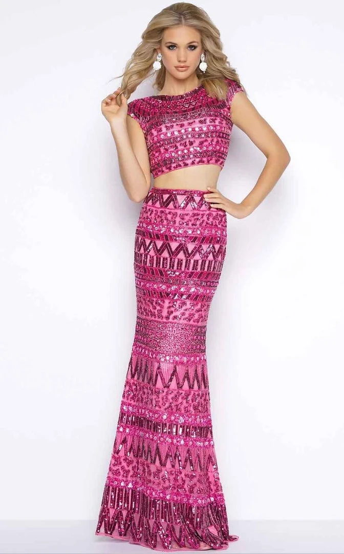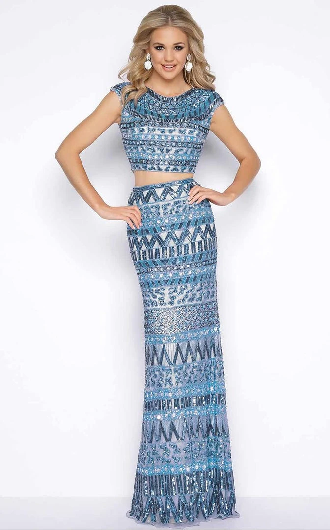 Unveil your free-spirit inspired style in pure glamour with this stunningly beaded Cassandra Stone 4515A creation. Wrapped in an intricately executed Aztec design made in shimmering sequins, this two-piece ensemble showcases a jewel neckline, cap sleeves and an ornate full back. Glittering at the waist with a sequined band, the trumpet skirt twinkles impressively as it flows down to a dazzling full-length hem. Make the headlines as the next budding star in this exquisite Cassandra Stone masterpiece.