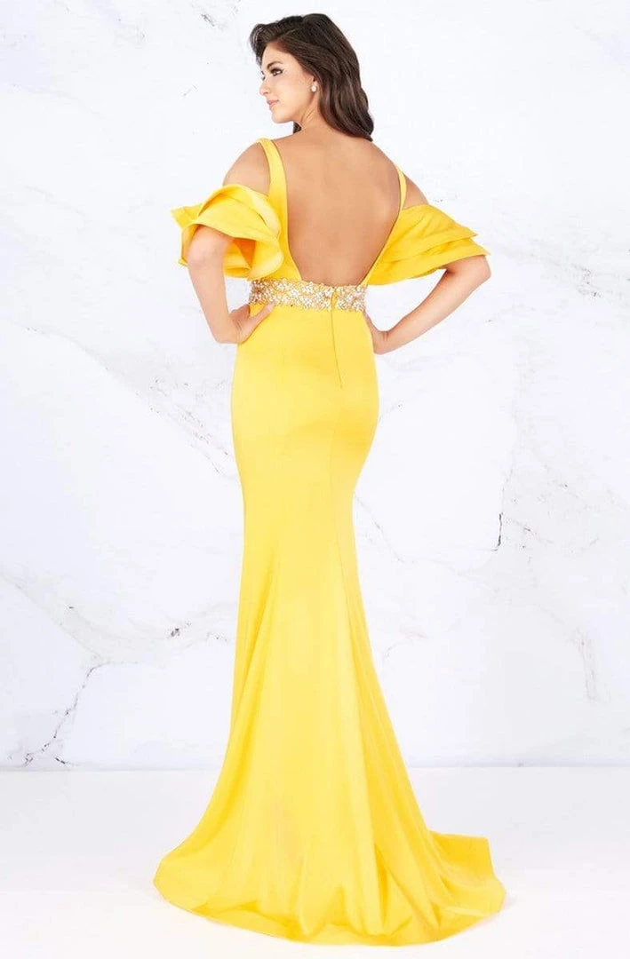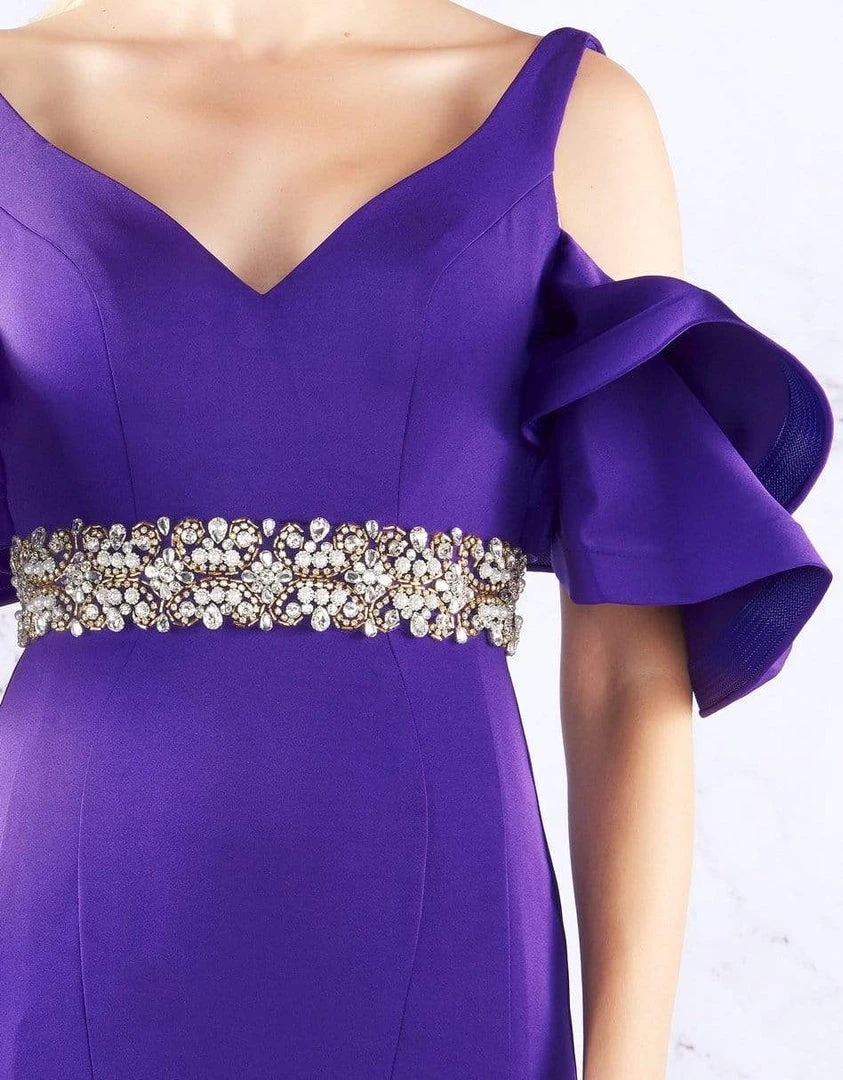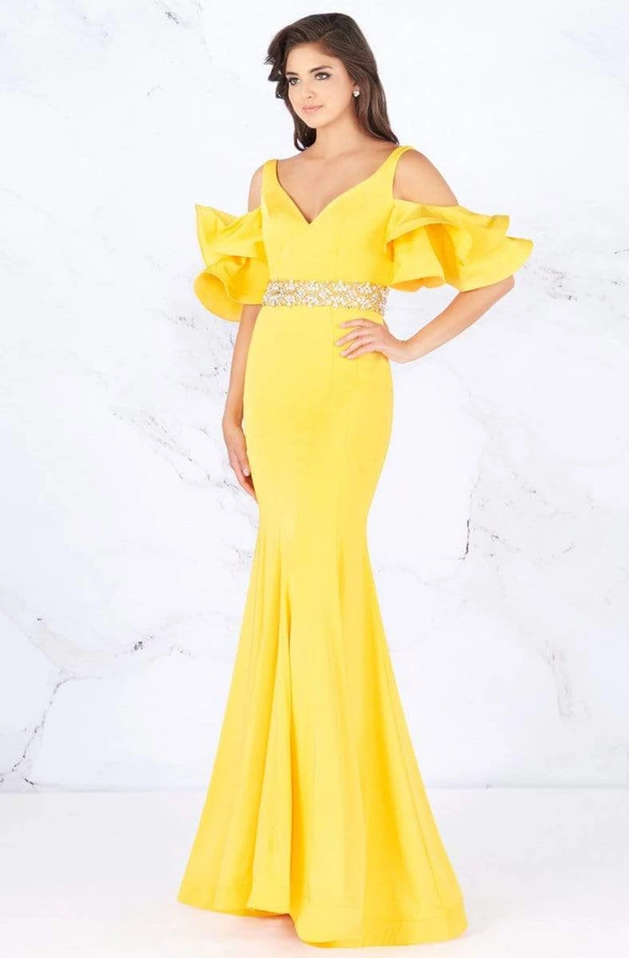 Leave a lasting impression as you don this dress from Cassandra Stone 66857. This sophisticated dress features a wide V-neckline with ruffled cold shoulder details. Giving texture and glitz to the look is a jeweled waist that flourishes a full length mermaid skirt. This Cassandra Stone dress is perfect for women looking for that stunning form-fitting style.