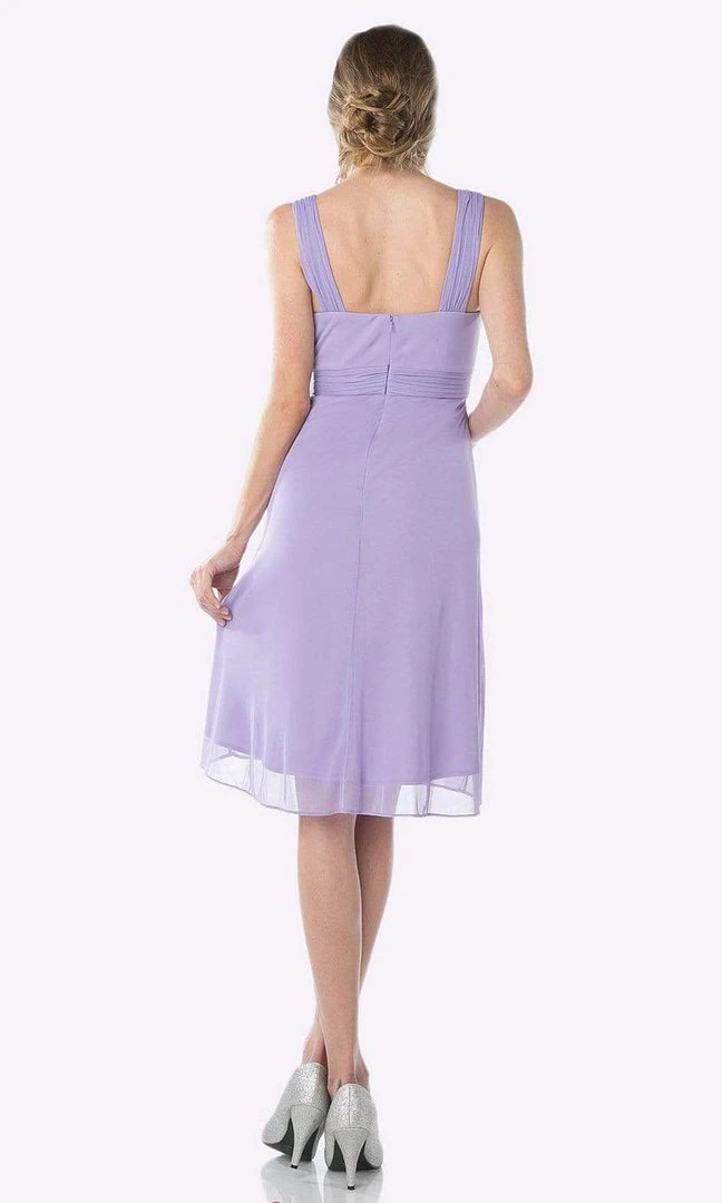 Portray a vision of loveliness in this classy piece by Cinderella Divine 3802. This flowy chiffon short dress charms in a sleeveless bodice textured with fine pleats, showcasing a V neckline with metal clasp accenting the shoulder straps. The dress flourishes with a classy A-line silhouette that finishes at the knee length. Keep it simple and sophisticated with this refined style by Cinderella Divine.