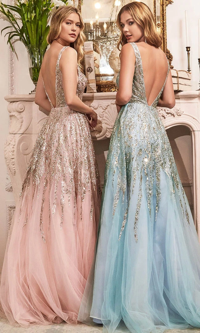 Make it a moment to shine in this Cinderella Divine C135 evening dress. Beautifully ornamented with trailing sequin applique, this dress fashions a plunging V neckline with sheer inset detail at the bust and cut out sides. The back shows a low V-shaped cut enclosed with zipper closure. The A-line skirt cascades elegantly to the floor as it finishes with a sweep train. This stunning Cinderella Divine design is sure to get you noticed. Whether you are looking for a unique prom dress to stand out, bridesmaid dresses or Mother of the Bride dress for that special day, or just an evening dress for a special night out, Cinderella Divine has your dress at the right price. Models are wearing the Blush, Champagne, Light Blue and Peacock colors.