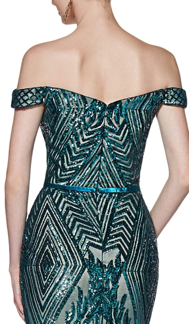 Enter the hall with divine aura wearing this remarkable evening gown by Cinderella Divine CB0039. This full-length sheath silhouette ensemble is highlighted with gorgeous geometric patterns of sequins, framed with an off-shoulder sleeves and sweetheart neckline. The natural waist features a tonal band leading to the floor-length figure flattering skirt that finishes with subtle brush train. Standout among the elite crowd and look glamorous in this bedazzled evening gown by Cinderella Divine.