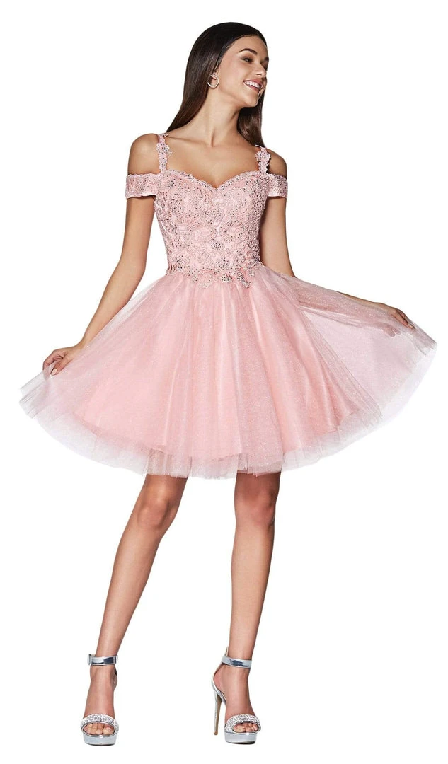 Enhance your visual appeal in this luxurious short cocktail dress from Cinderella Divine CD0132. This dress flaunts a romantic sweetheart neckline and cold-shoulder style sleeves with bodice richly styled in beautiful lace. The back has a lace-up detail while glittering tulle skirt flares in an A-line silhouette. Make it your moment to stand out wearing this Cinderella Divine short party dress.
