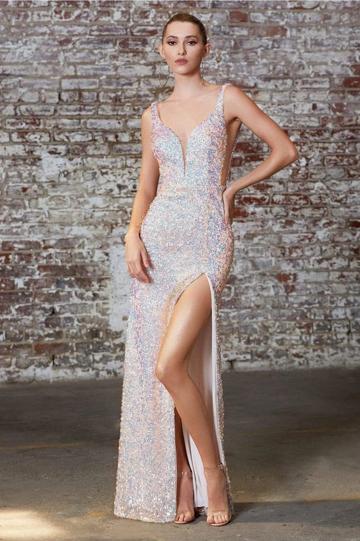 Turn heads effortlessly in this absolutely wonderful Cinderella Divine CD187 masterpiece. This fitted iridescent sequin gown showcases a plunging V neckline and V back with sheer panels on the bust and sides. A side slit accents the sheath skirt to perfectly elongate your sexy leg as it tapers to a full length hemline. Be in this gorgeous Cinderella Divine piece and leave a lasting impression.