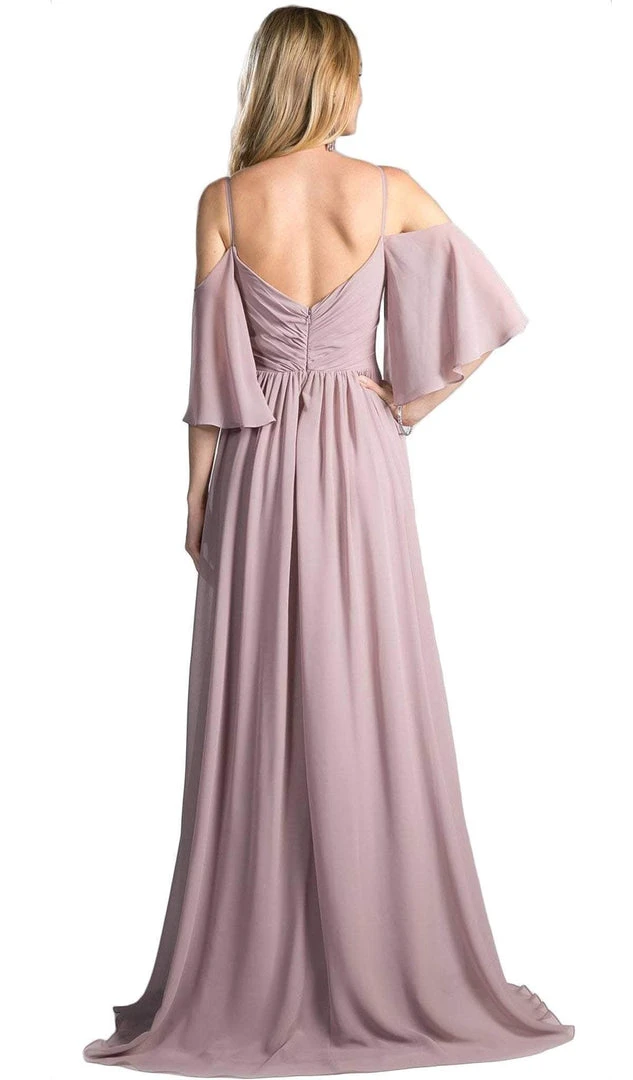 Revel in imperial sophistication as you spice up that spectacular event in this exquisite Cinderella Divine CJ267 long dress. Gorgeously parading a ruched surplice V-neckline bodice, this stunner shows a cold shoulder strap and short flutter sleeves with a plunging open V-back. The skirt is a fluttering cascade of rippled chiffon material flows magnificently down to the floor to create an elegant sweep train. Inspire everyone to turn their heads when you walk on the red carpet in this Cinderella Divine creation. Model is wearing the Mauve color.