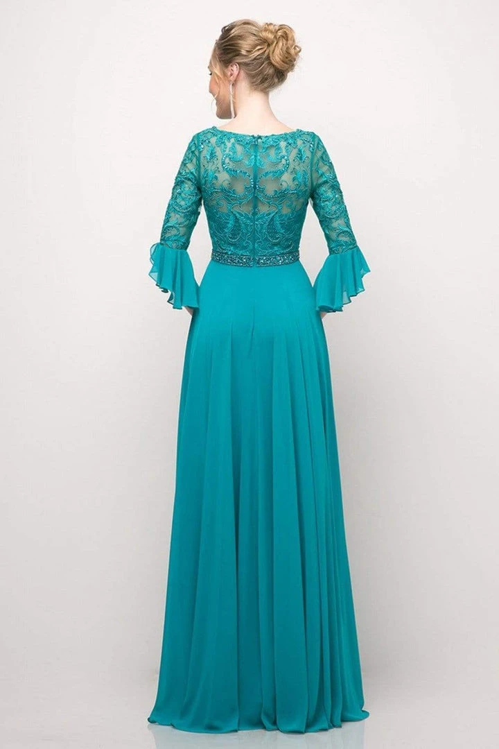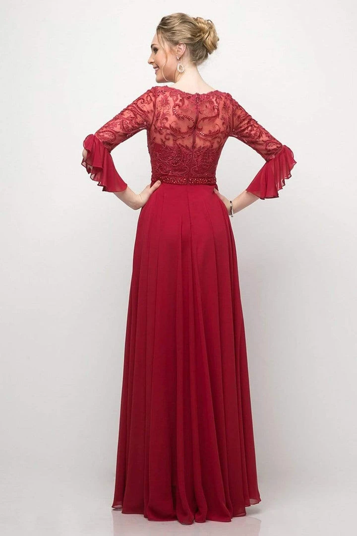 Sweep them off their feet with a style that is immaculate in this Cinderella Divine CR781 creation. Stunningly ornamented with a beaded lace bodice, this elegant piece shows an illusion bateau over a sweetheart neckline. Framed with adorned quarter sleeves with a fluttering flounce, this ensemble is also defined with an illusion full back. A bejeweled band embraces the natural waist as the chiffon A-line skirt flows down to a full-length hemline. Make magic while posing prettily in this Cinderella Divine masterpiece.