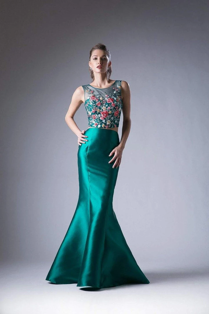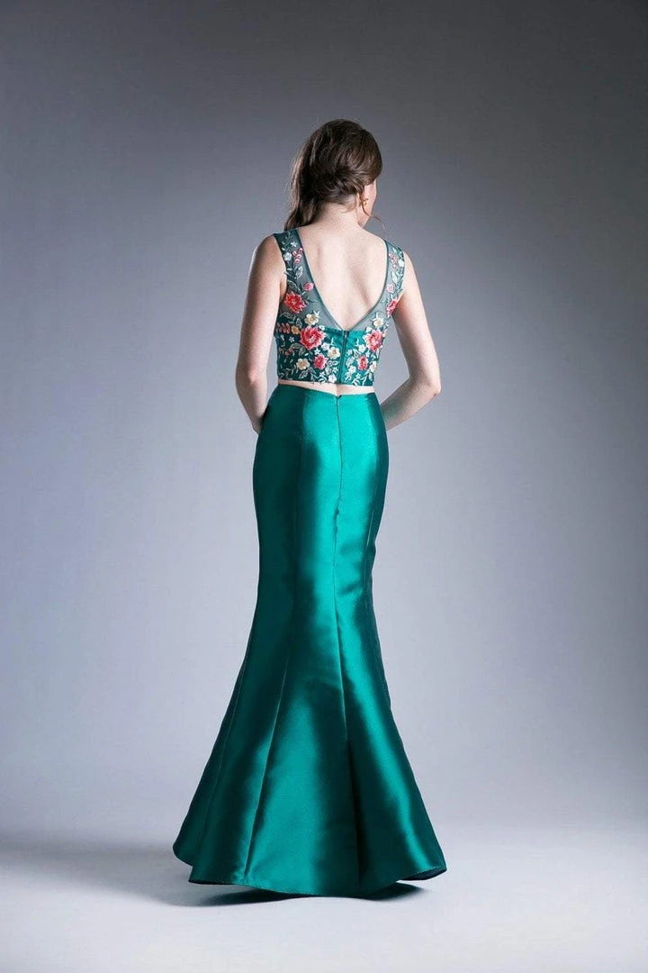 Show your feminine side in this attractive evening dress by Cinderella Divine HW03. This two piece stunner offers a fitted bodice adorned with beautiful floral appliques framed with an illusion scoop neckline. Adorned with tailoring seams, the skirt reveals a mermaid silhouette which tapers to full length. The back has a distinct V cut secured with a center zipper closure. Put your best foot forward in a lovely creation from Cinderella Divine. Model is wearing Green color.
