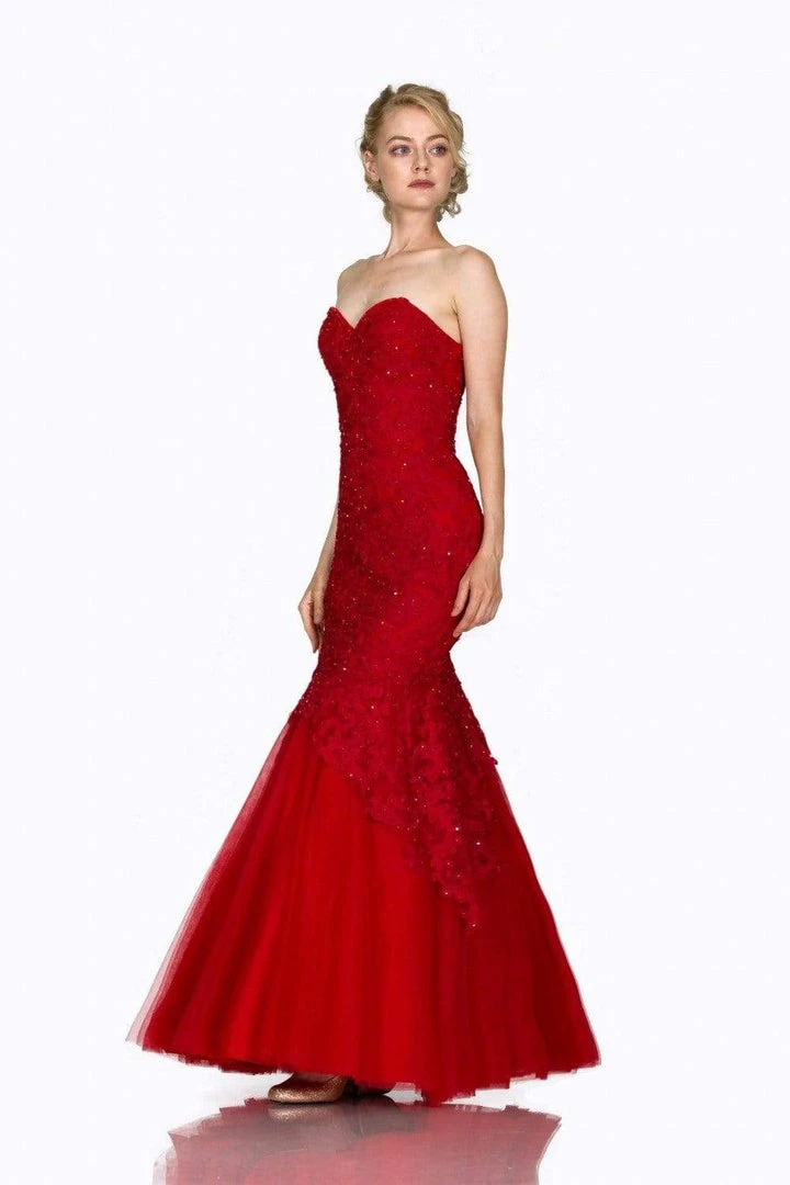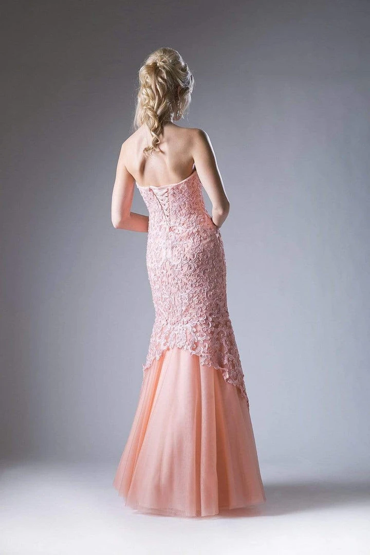 Be strikingly gorgeous in as you enter the hall wearing this fabulous mermaid gown by Cinderella Divine KC1701. This chic mermaid silhouette gown is crafted with Beaded lace applique over Tulle fabric. This elegant ensemble boasts a strapless sweetheart neckline, fitted bodice and lace up back style. With its mermaid fishtail finish in layers of tulle, the dress ends at floor length. Charm everyone from all angles as you shine all night long in this Cinderella Divine masterpiece.