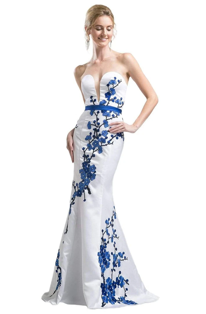 Charm everyone with the sophisticated air of this Cinderella Divine KD052 creation. Sculpted with tracing lines on a sleek satin silhouette, this refined piece flatters with a plunging sweetheart neckline and an illusion inset. Rendered with a strapless style, embroidered floral appliques depict trailing branches of cherry blossoms. Gliding to form a statuesque silhouette, the mermaid skirt fits and flares into a sweep of train. Be the embodiment of classy allure in this Cinderella Divine masterpiece. Model is wearing the White/Royal color.