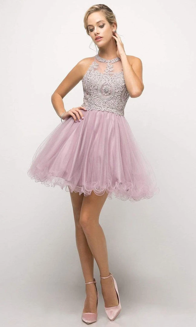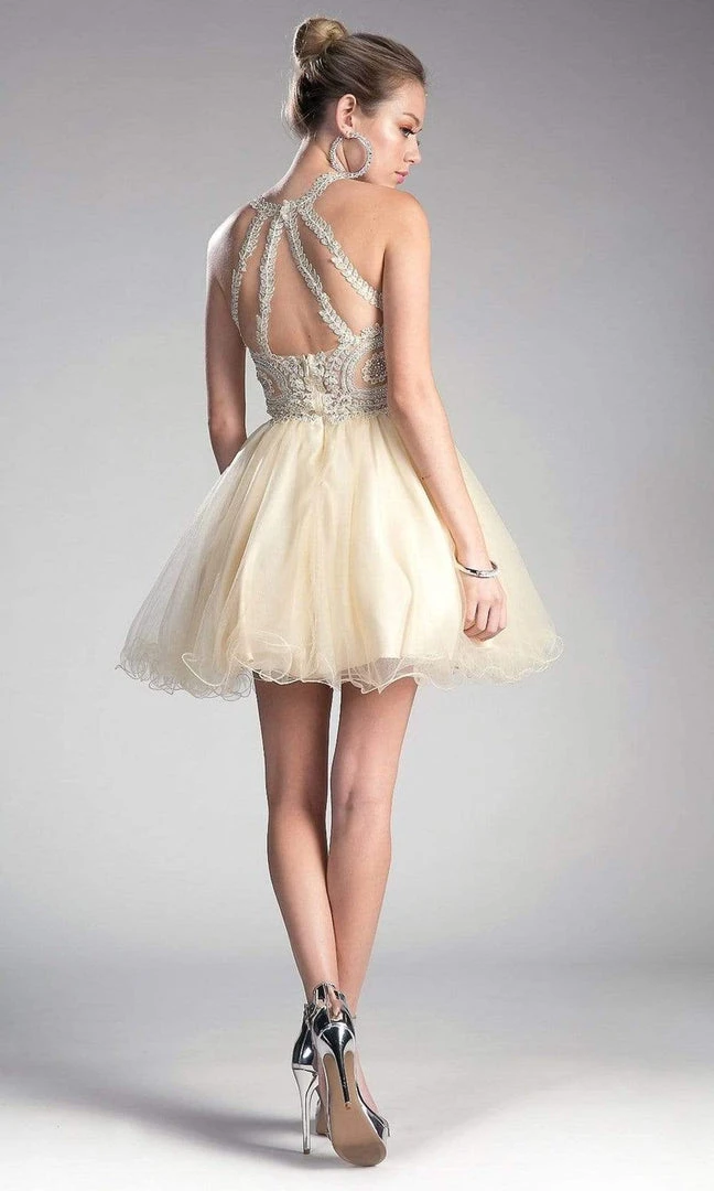 Captivate everyone with your striking vintage charm in this beautiful Cinderella Divine UJ0119 creation. Lavishly ornate with beaded lace applique bodice, this exquisite piece shows a cut-in shoulders and jewel neckline. Designed with corded lace strappy back and short hem rolled tulle skirt this party dress is a real knockout to the dance floor. Embrace a glamorous style that would mesmerize everyone in this Cinderella Divine creation.Â