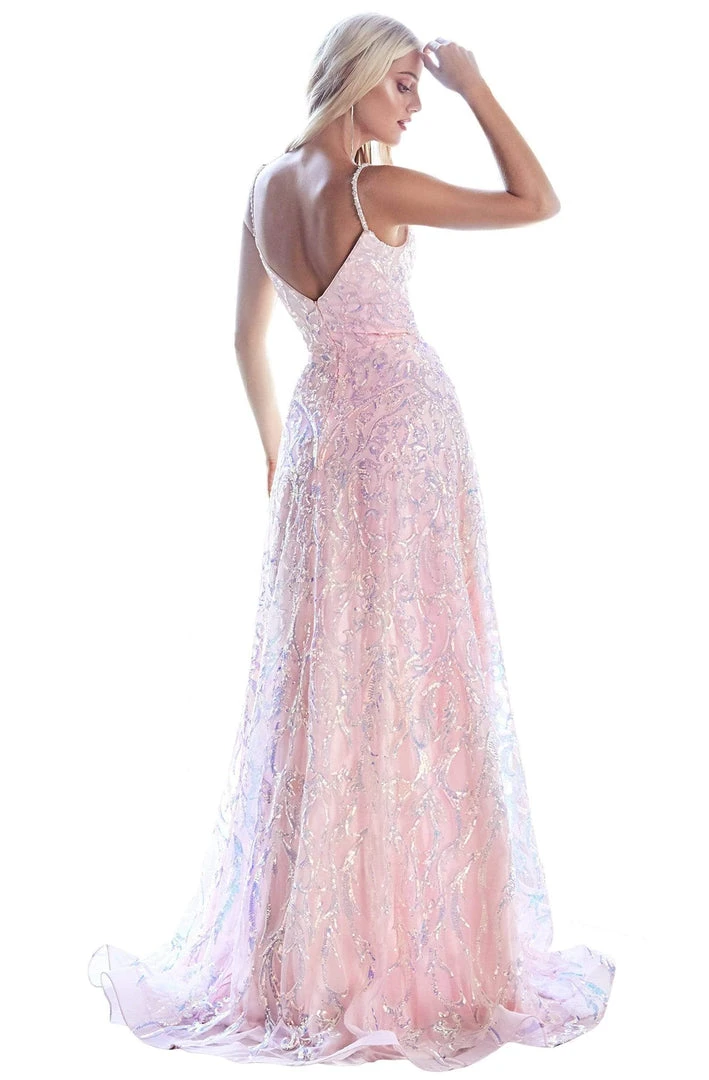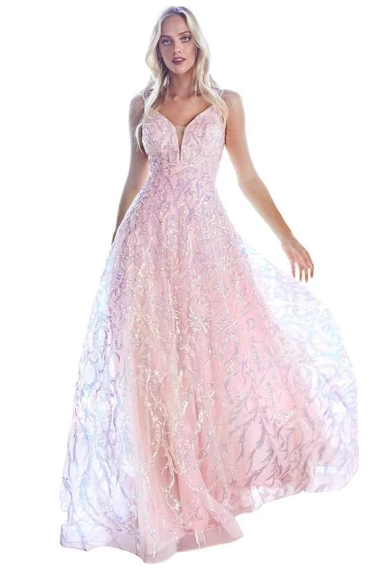 This stellar gown is draped with spectacular sequin scroll pattern on mesh overlay, showcases a flattering illusion deep V neckline on the fitted bodice with sheer mesh inset while the back flaunts a wide V shape mid-open cut enclosed with a center zipper closure. The fitted bodice is styled with princess seams while being held by beaded spaghetti straps. From the waist flourishes a full-length A-line skirt that finishes with a modest sweep train.