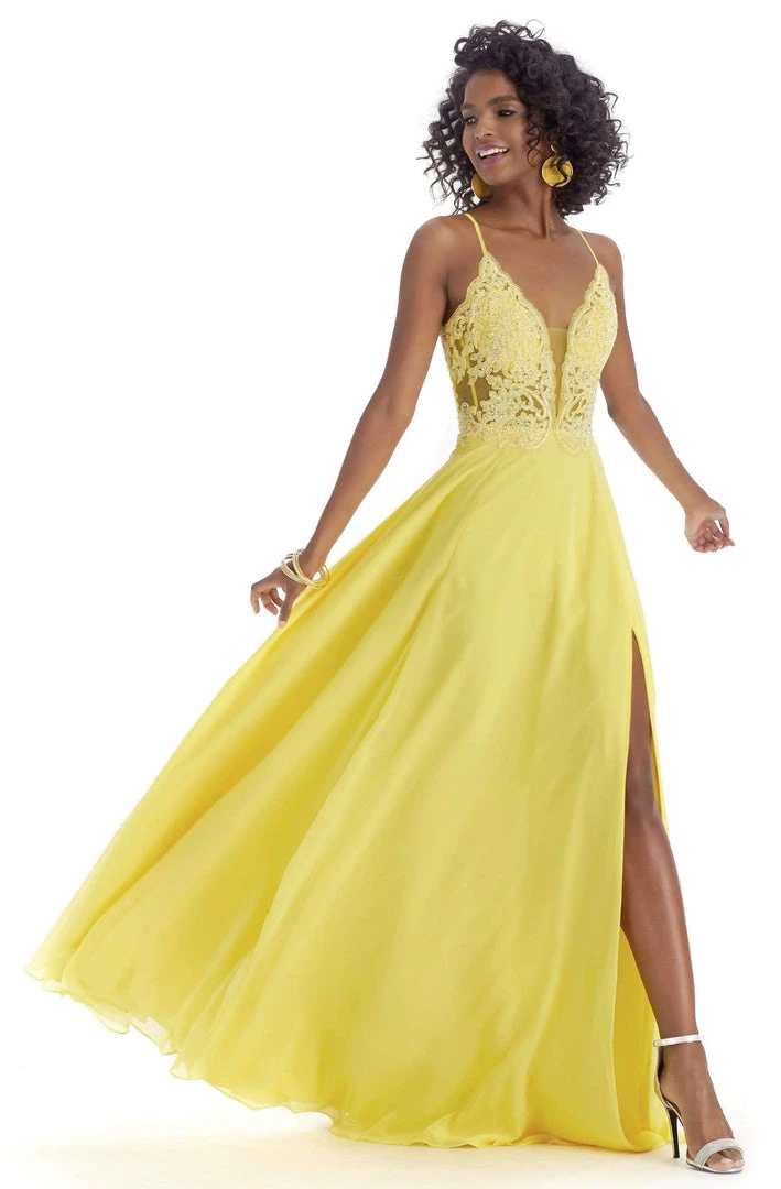 Show off your trendsetting style when you wear this design by Clarisse 8021. Mesmerizes in a sleeveless, deep V-neckline with embroidered bodice supported with spaghetti straps. The dress has a strappy back while the full length A-line skirt is tailored with a thigh high slit. Be the spotlight wearing this extravagant Clarisse dress.