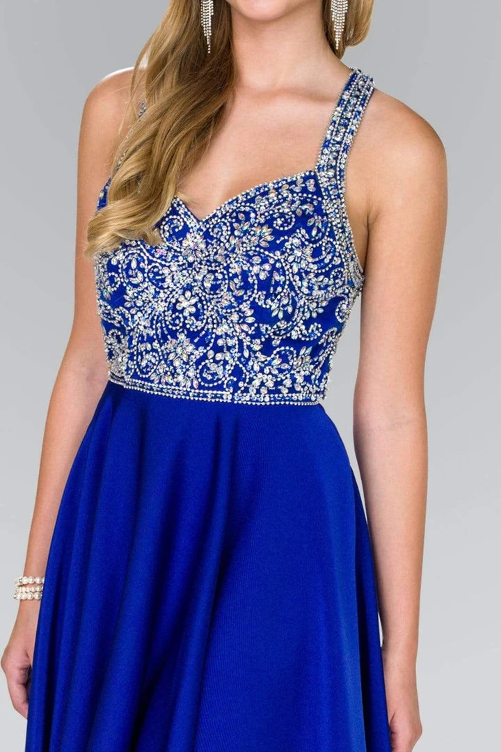 High-spirited and extraordinary, this rich cocktail dress from Elizabeth K GS2412. Fashions a sleeveless, V-neckline with fitted bodice brilliantly ornate with bead embellishments. The back is styled with an alluring cutout while the chiffon skirt opens in a mid-thigh A-line silhouette. Look beautiful in this romantic dress from Elizabeth K.