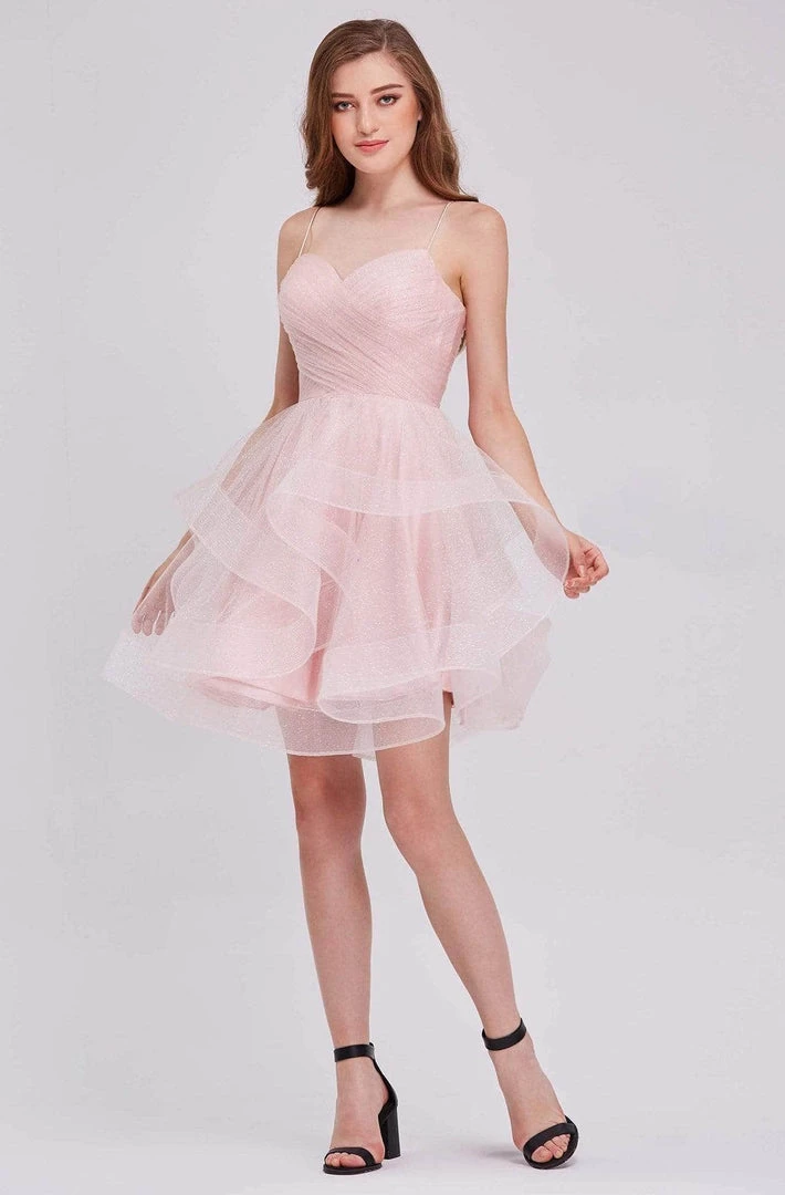 | Details: | Spaghetti strap, Fitted bodice, Tulle fabric, Pleated bodice, A-line cocktail dress, Ruffled skirt, back zipper |