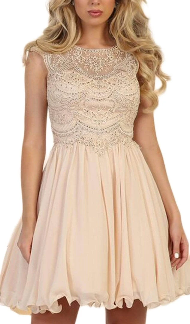 Offered in a chic fit and flare silhouette, this short party dress is framed with cap sleeve and scoop neckline with embroidered sheer yoke and shoulders. The sweetheart shaped lining is shrouded by an embellished sheer overlay with scallop patterns of lace applique, embroidery and rhinestone beads. From the natural waist, the pleated chiffon skirt flares and finishes at mid-thigh length. Models are wearing Color Champagne, Blush, White, Mauve and Silver colors.