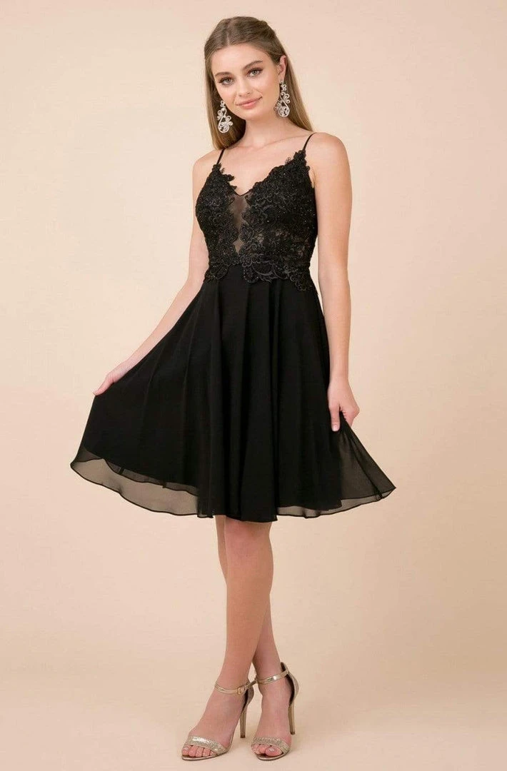 Sparkle in beauty wearing this dress by Nox Anabel A660.Appeals in a sleeveless, V-neckline with fitted bodice designed with beaded lace. Spaghetti straps support the bodice and from the waist features a flowy A-line skirt. Be a vamp in an alluring dress from Nox Anabel.