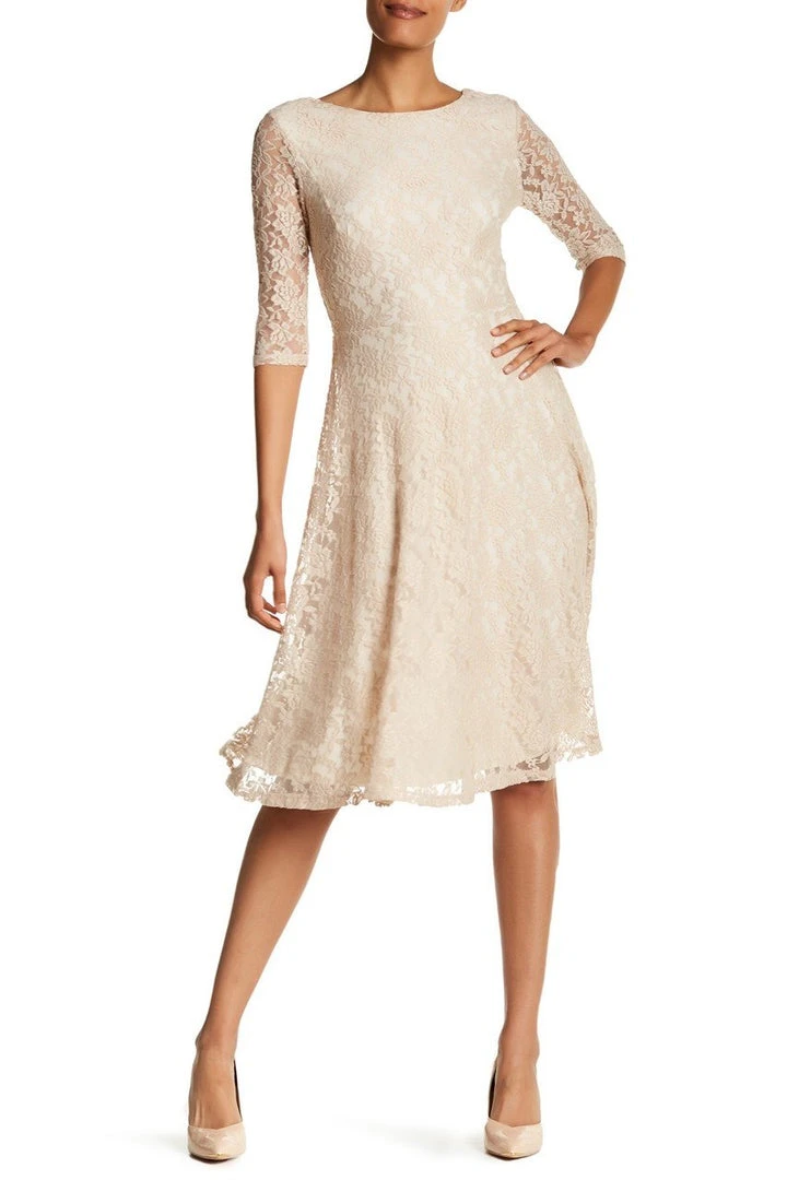 | Details: | Floral Lace, Sheer Quarter Sleeves, V-Cut Open Back, Invisible Back Zipper, Hook and Eye Closure, Embroidered Mesh, Flared Skirt, Tea Length Hem |
