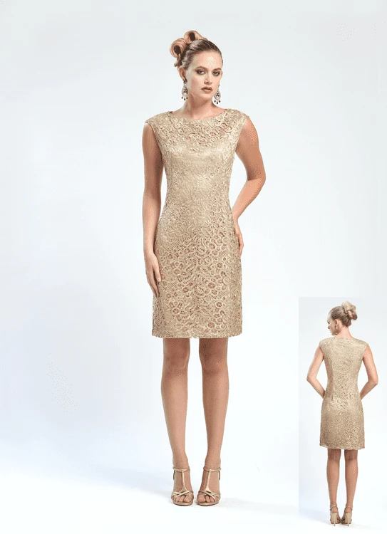 Be stunningly stylish and sophisticated in this gold lace number by Sue Wong N4441. Sheathed in intricate crochet lace overlaying a nude silhouette, this gorgeous piece shows a bateau neckline, cap sleeves and a full back. Molding every curve with grace, the sheath skirt skims down to a modest shot hemline. Go from your nine to five to your special date with timeless elegance in this exquisite Sue Wong masterpiece. Model is wearing the Gold color.
