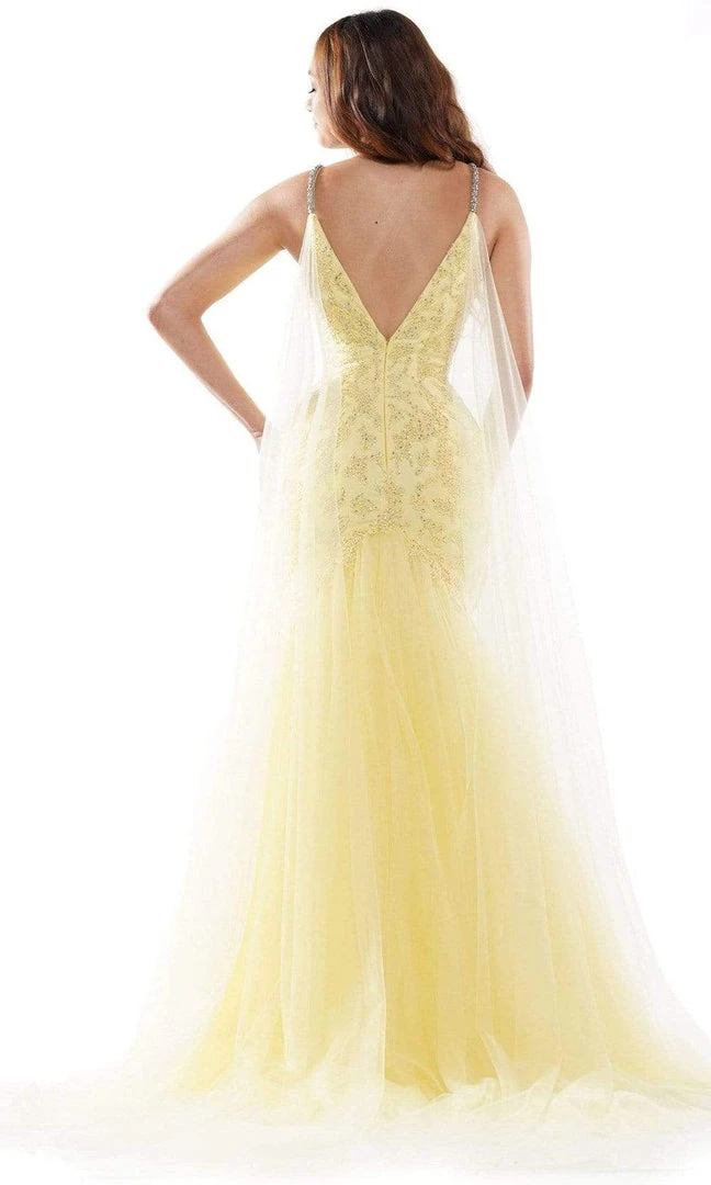 Glide into that spectacular black-tie event like an ethereal vision as you flaunt this gorgeous creation from Colors Dress G962. Adorned with beads and lace appliqued, this stunning gown showcases a sleeveless and plunging V neckline while the open back shows off a V-shaped cut, followed by a center zipper closure. The gown glistens with its beaded straps while a dramatic long cape flows from each side of the shoulder. The skirt flourishes in a full-length mermaid silhouette and ends with a sweep train for added drama. Stand out among the fabulous crowd as all eyes focus on you in this glamorous Colors Dress masterpiece.