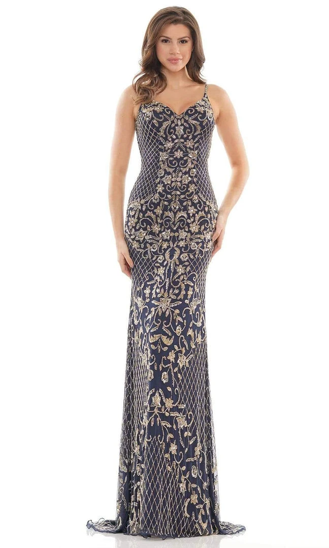 Have an enchanted evening at the ball in this gorgeous gown in Colors Dress K122! Gorgeous in a sheath silhouette, this exquisite number is adorned in hand sewn sequins in lattice and filigree patterns. Meanwhile, the decolletage neckline is framed with glittering straps that split and connect in a lattice patter over the back. Make it your moment to shine in this lavishly embellished evening gown by Colors Dress.
