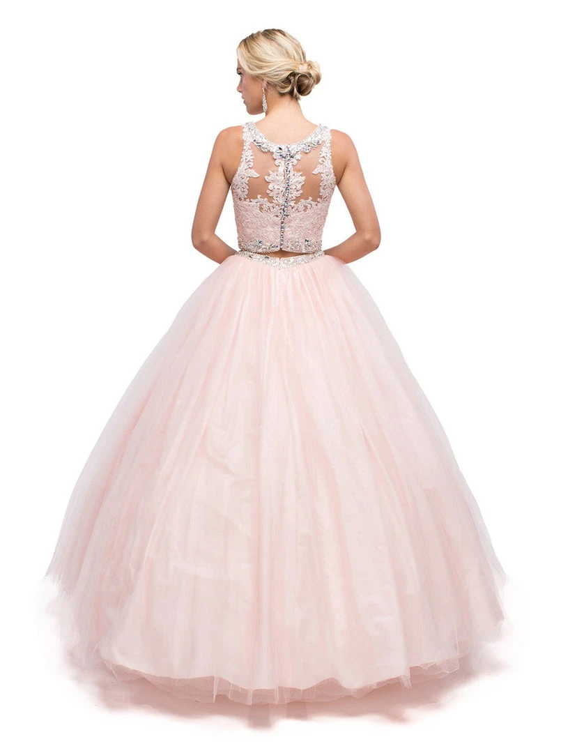 | Details: | Two piece gown, Illusion details, Lace bodice, Ballgown skirt, Pleated, Sleeveless, Scoop back, Back zip closure |