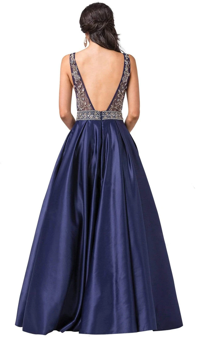 | Details: | Sheer Bodice, Sleeveless, Rhinestones, Beaded Waist, Ladder Banded Plunge, Plunging V-Open Back, Back Zipper Closure, Inseam Pockets, Full Length hem |