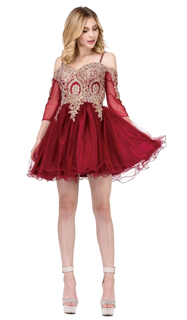 Get glammed as you wrap up in this winning style by Dancing Queen 3001. This stunning cocktail dress is beautifully crafted with a charming sweetheart neckline and trendy cold shoulder style, sheer quarter length and beaded shoulder strap. Gold lace applique with sparkling beads elegantly adorns the bodice, with a corset style lace up back ensuring a body-hugging fit. Soft gathers of tulle overlay emerge from the natural waistline as it flares and finishes at mid-thigh. Win the night over wearing this bouncy and pretty Dancing Queen cocktail dress.