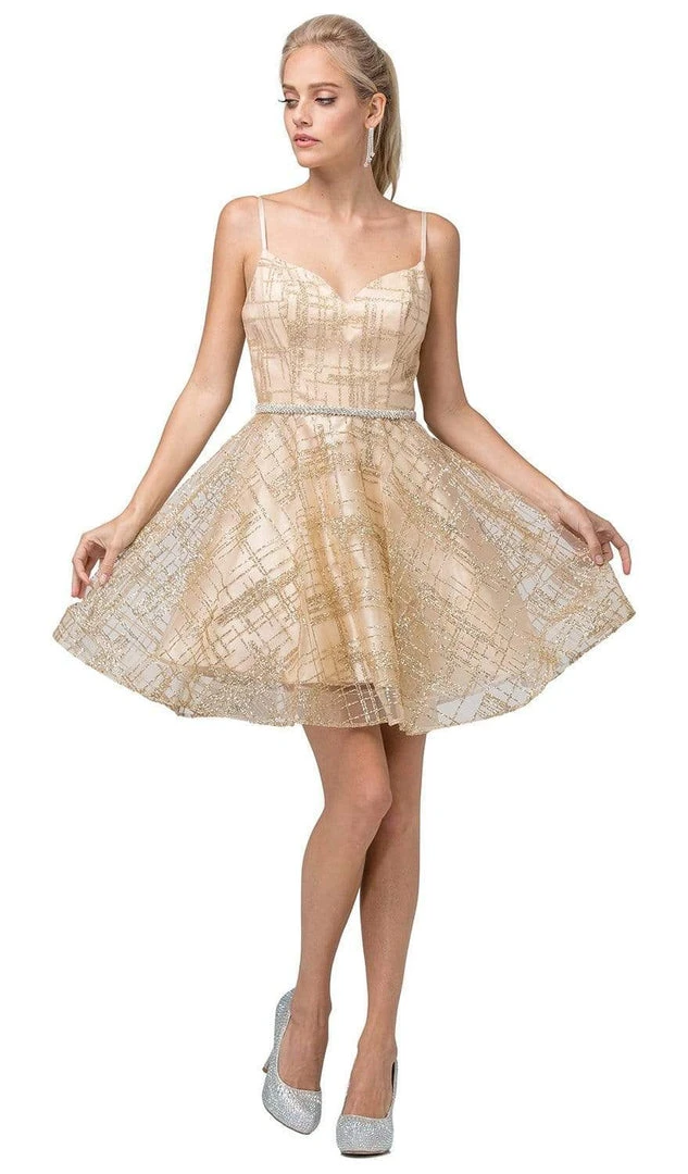 Bring that chic style to your upcoming event with this Dancing Queen 3185 cocktail dress. The whole ensemble is designed in dazzling glitters as the fitted bodice features a sweetheart neckline, supported with spaghetti straps which lead to the mid-open back. The natural waist is accented with a beaded belt as it leads to the softly pleated skirt that cascades above the knee hemline. Be beautiful in this fashionable Dancing Queen piece.