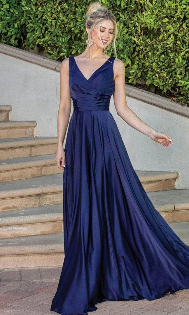 Be dazzled with the sleek beauty of this Dancing Queen 4262 creation. Ornamented with wide pleats that crafts into a faux wrap bodice, this piece reveals a v-neckline with tapering shoulder straps. Intricately cinched with a corset styled back, the gleaming skirt cascades to touch the floor with a sweeping denouement. Embrace the fascinating style of this gorgeously sleek Dancing Queen masterpiece. Models are wearing the Burgundy, Copper, Dusty Blue, Hunter Green, Navy, Plum and Royal Blue colors.