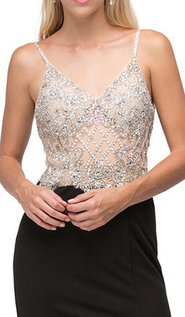 | Details: | Sheer embellished bodice, Spaghetti straps, High side slit, Open back |