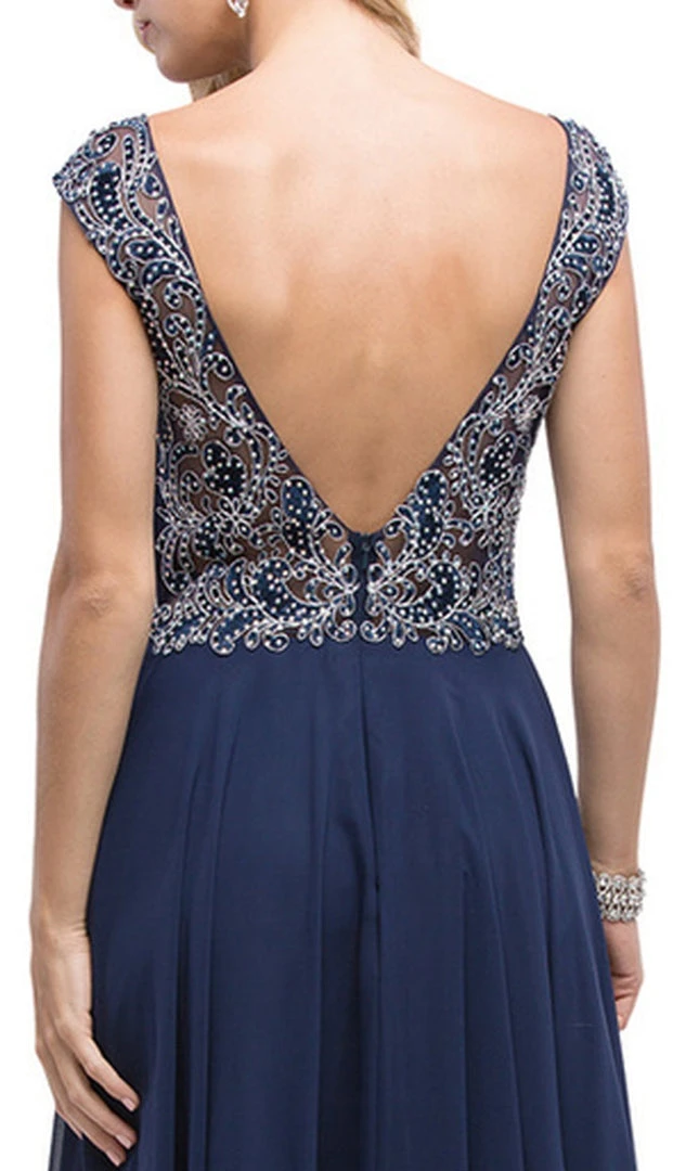 Crafted from soft lace, this ultra-feminine cap sleeve long dress has a romantic style. Featuring dazzling beaded accents on the sheer illusion bodice, deep v-open back and waist this dress will make any occasion special. It’s a classic look that works for many special occasions.
