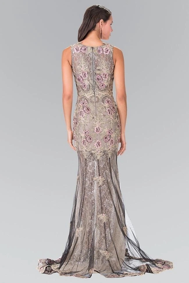 This long dress features a bateau neckline and a lace and mesh material. Paisley and floral embroidery cover the mesh overlay. A lace insert can be seen from beneath the mesh. Zips in the back. This mermaid silhouette flares down into a lace trimmed sweeping train