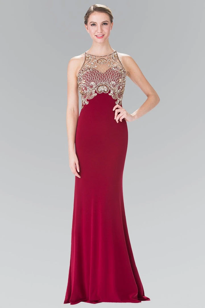 Show of that regal poise and grace in this glamorous beauty Elizabeth K GL1303 creation. Featuring an intricate display of beads and jewels in a lattice design, this stunning piece offers a halter illusion over a sweetheart neckline and an illusion back. Bordered with a dazzling scrolled inverted Basque waist, the fitted sheath skirt flows fluidly down to a full-length hem. Expect to reap flattering glances in this stunning Elizabeth K masterpiece.