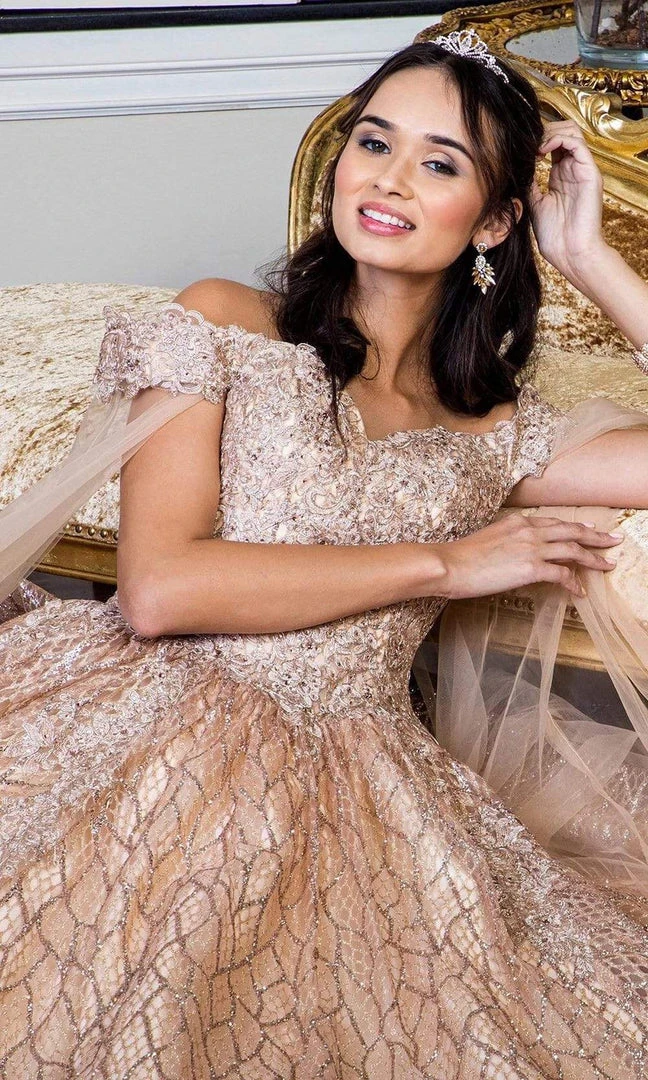 Parade the elegant and stunning side in this Elizabeth K GL1926 evening dress. The whole ensemble is designed in glitter embellishments as the fitted bodice showcases an off shoulder neckline and cut-away shoulders. The skirt graces a ballgown silhouette. Have all eyes on you as you show up in this Elizabeth K creation.