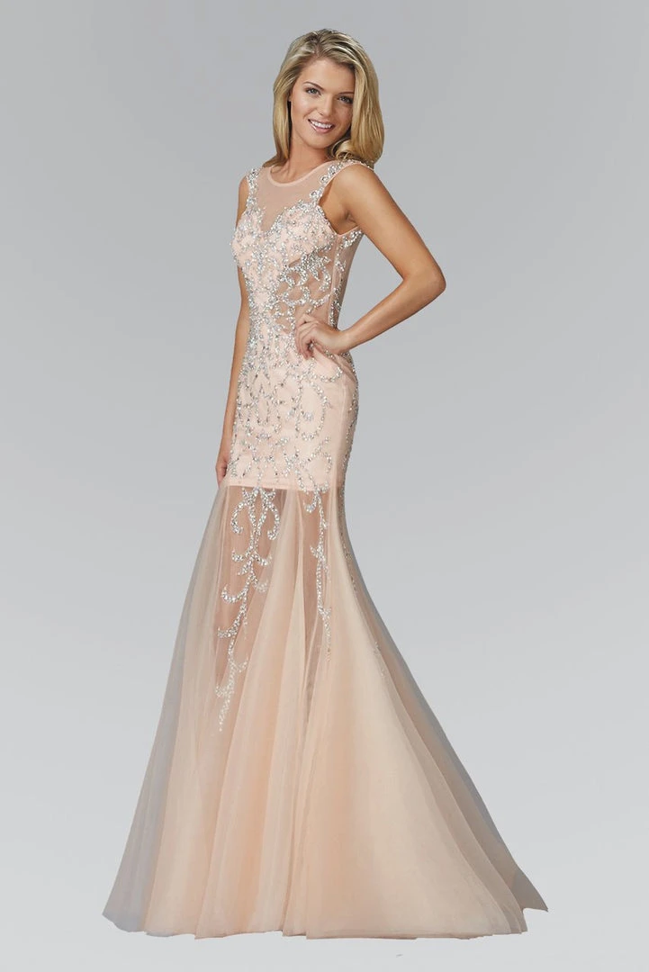 Walk the red carpet in style wearing this stunning gown by Elizabeth K GL2153G. This gown offers a scoop neckline of sheer fabric. Sparkling beads form the shoulder straps and adorn the form-fitting silhouette. Sheer sides lead the low scoop back enhancing your attractive shape. This Elizabeth K creation is sure to create a striking look that is sure to make anyone remember your grand entrance. Model is wearing Nude color.
