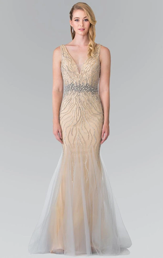You will always be in style in this Elizabeth K GL2344 design. V-neckline in front and back flatters your alluring skin. Clustered beads belted the waist and scattered all over the mermaid silhouette. Look remarkable for the party in this Elizabeth K style.