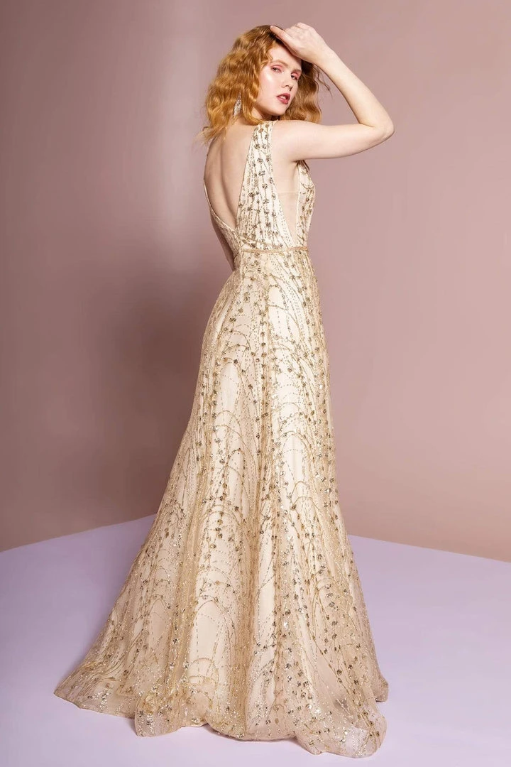 Radiate pure elegance as you dance the night away in this fantastically ornate Elizabeth K GL2691 creation. This sleeveless gown features a deep V-neckline with sheer panels. Ornate in mesh glitter, the dress flaunts a low V-back and has a zipper closure. The fitted bodice forms a full length A-line skirt. Embrace a classic sense of style in this engaging evening gown by Elizabeth K.