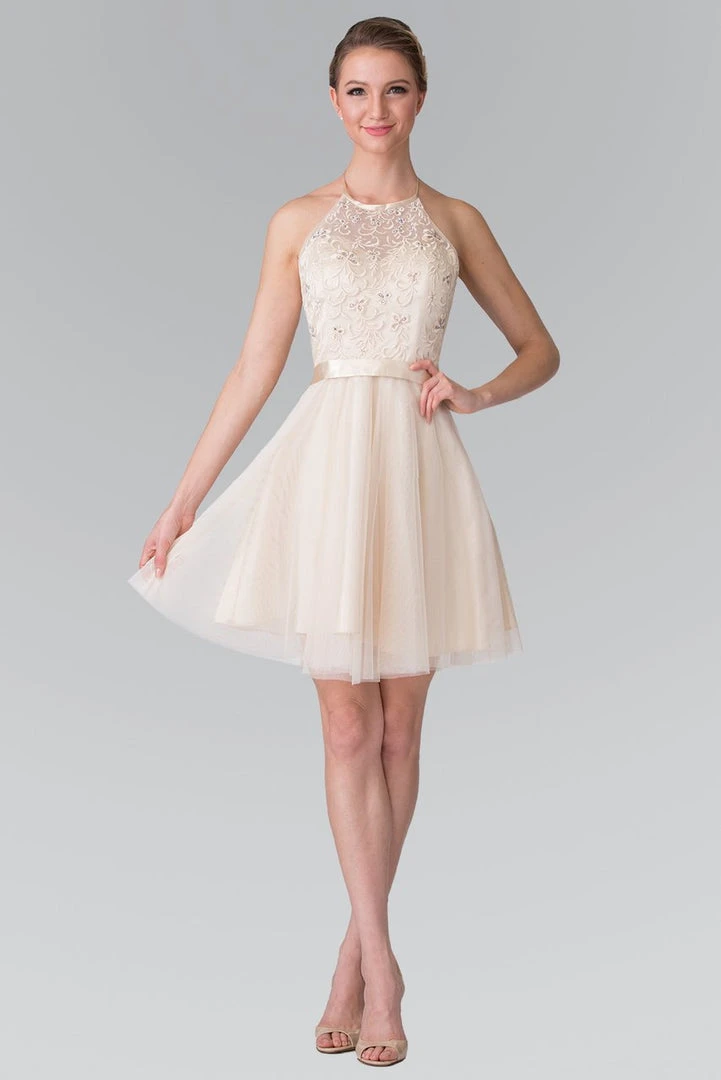 Mesmerize the crowd as you walk in Elizabeth K GS1465. Features a sleeveless, halter neckline with bead embellishments that decorate the bodice. Layered short skirt compliments your gorgeous legs. Make magic in this fantastic dress from Elizabeth K.
