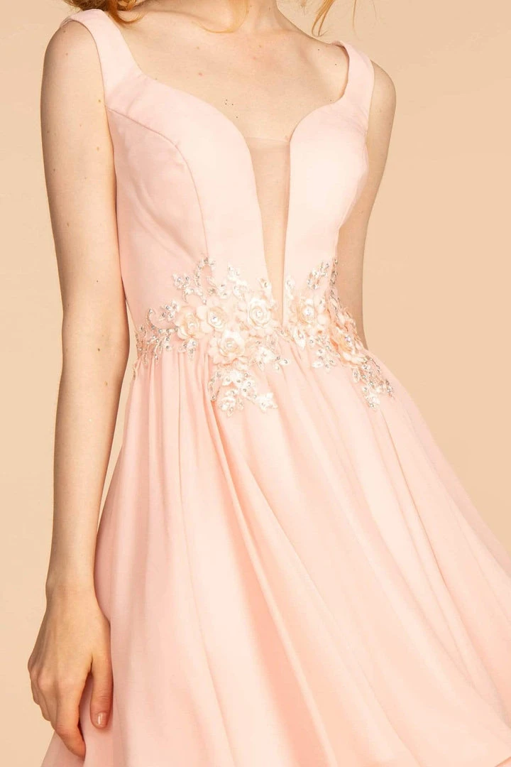 Wear this Elizabeth K GS1617 dress and be dressed to kill the night away. This sleeveless dress showcases a deep V-neckline with sheer inset at mid-bust. The bodice is lined with visible seams and is accented with floral appliques at the waist. The back has a low scoop cut and a zipper closure while the chiffon skirt has a flowy A-line silhouette. Look sharp and make heads turn in this dashing Elizabeth K dress.